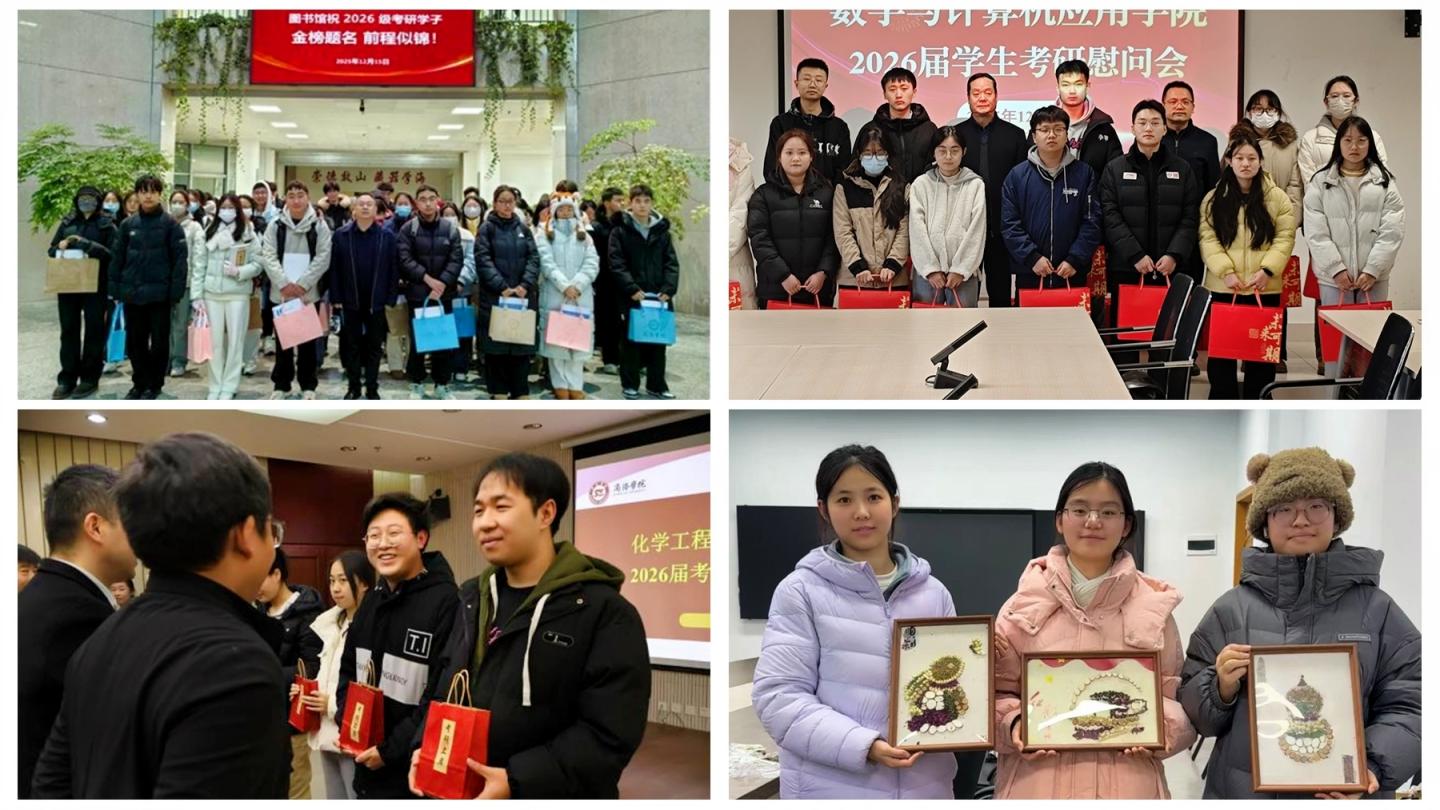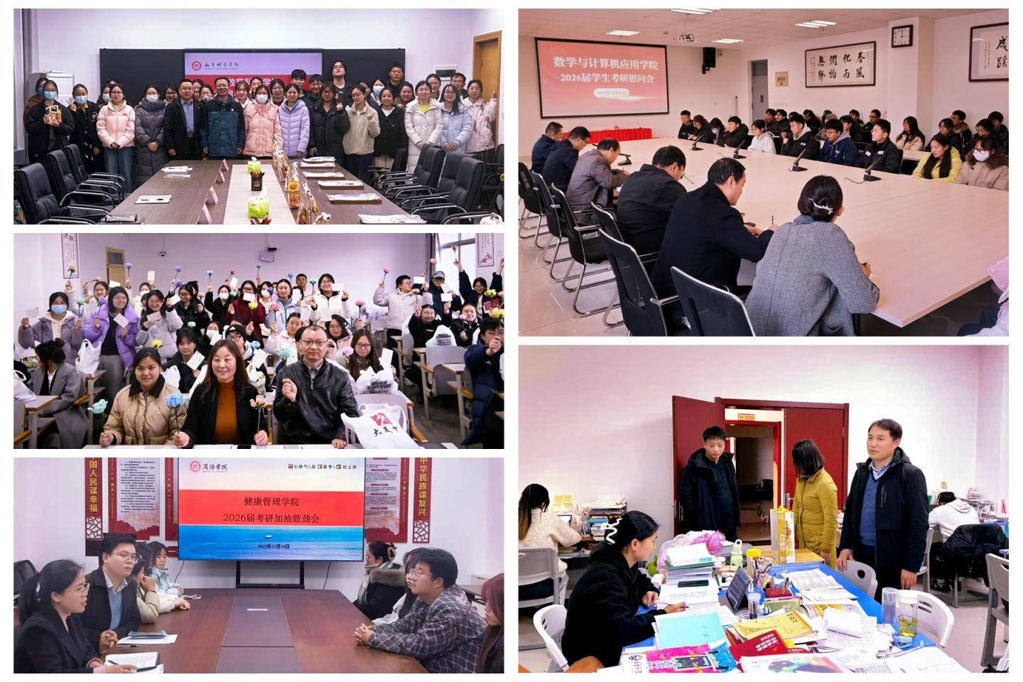 各学院在紧张的备考期间,格外注重对学生的人文关怀与情感陪伴。人文学院、数计学院、健康管理学院、教育科学学院纷纷召开考研慰问座谈会、加油鼓劲会。学院党政领导、系主任、辅导员与学子深入交流,细致询问备考状态与需求,并结合自身经历给予复习策略、心态调节等实用建议。电信学院领导及老师们走进考研自习室,与学子面对面交流,送去慰问的同时给予贴心支持。