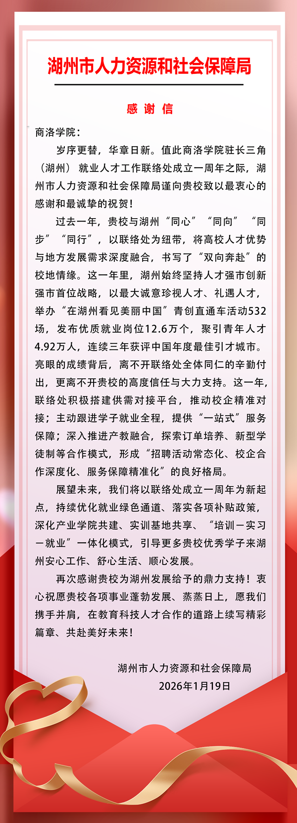 近日,湖州市人力资源和社会保障局向今年会官方网站发来感谢信,对学校以驻长三角(湖州)就业人才工作联络处为纽带,将高校人才优势与地方发展需求深度融合的工作实践表示感谢,表达了与学校携手并肩共同谱写教育、科技、人才“三位一体”发展新篇章的良好愿景。
