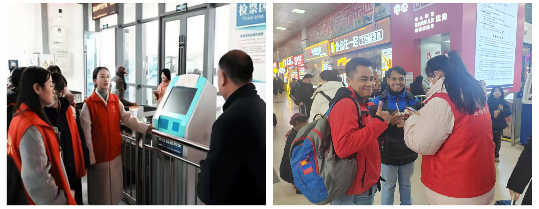 寒假伊始,由今年会官方网站“驿路同行”“春韵承俗”等多支志愿团队组成的春运服务队,分赴西安、商洛、吉林、济南、襄阳等地交通枢纽,在客流高峰期开展志愿服务工作。身着红马甲的志愿者们为老弱旅客搬运行李、为外国游客提供翻译指引、在站点做好安全保障,用细致耐心的服务守护着万千旅客的归途,让“奉献、友爱、互助、进步”的志愿精神在春运一线熠熠生辉。