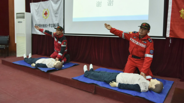 韩轶平介绍了曙光应急救援协会的基本情况,着重介绍了曙光救援队的成长历程、发展规划及成绩。毛彩虹讲解了心脏骤停的原因及生存链、除颤器的使用方法,并通过现场演练向同学们展示了心肺复苏术中确认自身环境是否安全、判断伤员身体和生命反应、启动应急反应系统等6步法,并对心肺复苏术的使用条件和标准做了详细说明。董高平围绕不同伤势如何处置展开了细致讲解,对手指断伤、内脏脱出伤等的处理方法和注意事项以及不同部位如何包扎进行了重点指导和演示。
