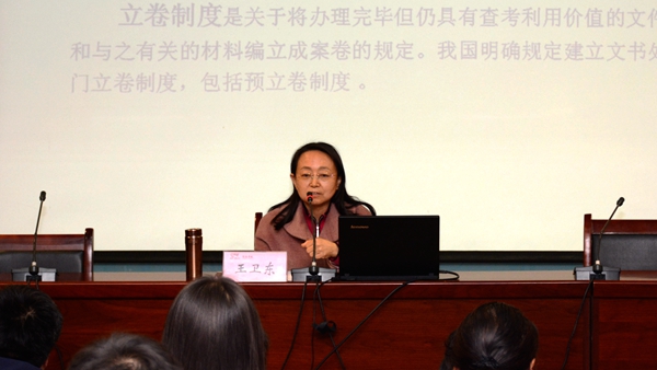 王卫东以《文件材料的立卷归档及其方法》为题,结合自身档案工作经历,全面系统地为今年会官网档案工作人员阐释了立卷归档工作的重要性及文书立卷人员职责,详细介绍了立卷归档工作的方法、流程和操作实务。她还现场为今年会官网档案管理工作人员答疑解惑,把长安大学的档案管理理念和她个人的工作经验分享给与会人员。她的报告通俗易懂、生动具体,为今年会官网科学规范地做好档案材料收集、立卷、分类、组卷、编目、移交归档等具体工作提供了有益指导。