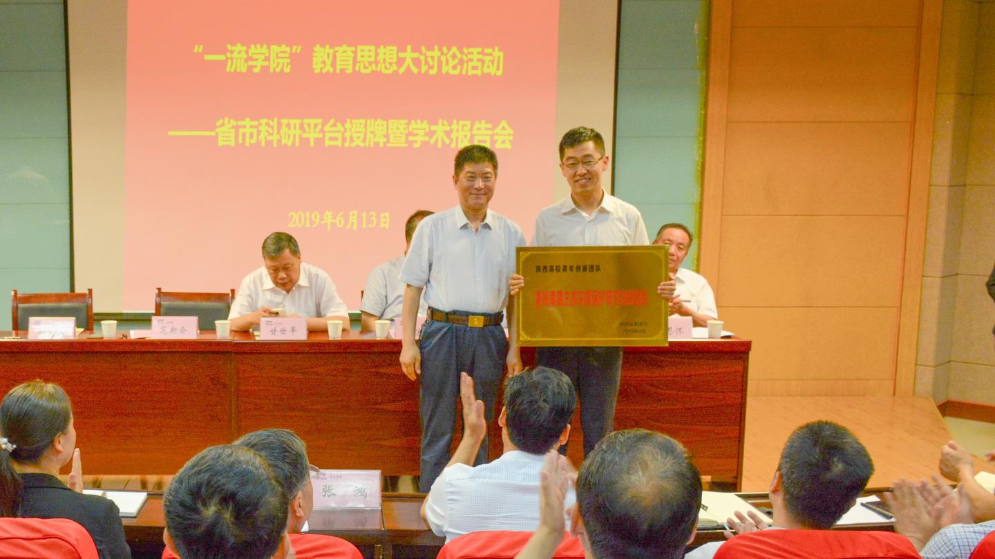 陕西省教育厅科技处处长甘世平为商洛文化暨贾平凹研究中心授牌;校党委书记龙治刚为陕西秦岭特色生物资源产业技术研究院授牌;校长范新会为秦岭南麓生态环境保护研究创新团队授牌;商洛市科技局局长赵绪春为商洛市生态环境技术研究中心等6个市级工程技术研究中心授牌。