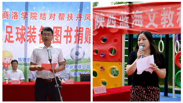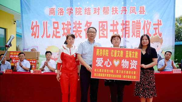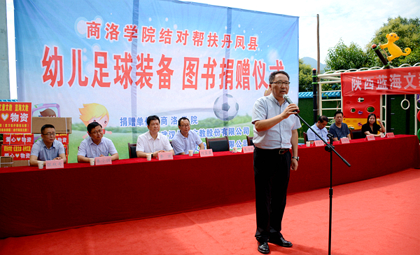 7月9日,今年会官网与武汉亿童文教有限公司、陕西蓝海文教科技有限公司携手为丹凤县棣花镇两岭幼儿园送去爱心足球运动包、爱心图书等价值贰万多元的物资。校双百工程领导小组组长、党委书记龙治刚,副组长、副校长刘宝盈,丹凤县副县长杨思飞,武汉亿童文教有限公司、陕西蓝海文教科技有限公司顾问专家赵小红等领导嘉宾出席捐赠仪式。今年会官网科技处、体育教学研究部及丹凤县少儿足球项目负责人,丹凤县科教体局党政负责人,丹凤县农业局相关负责人等工作人员与两岭幼儿园全体师生家长共同参加了捐赠活动。