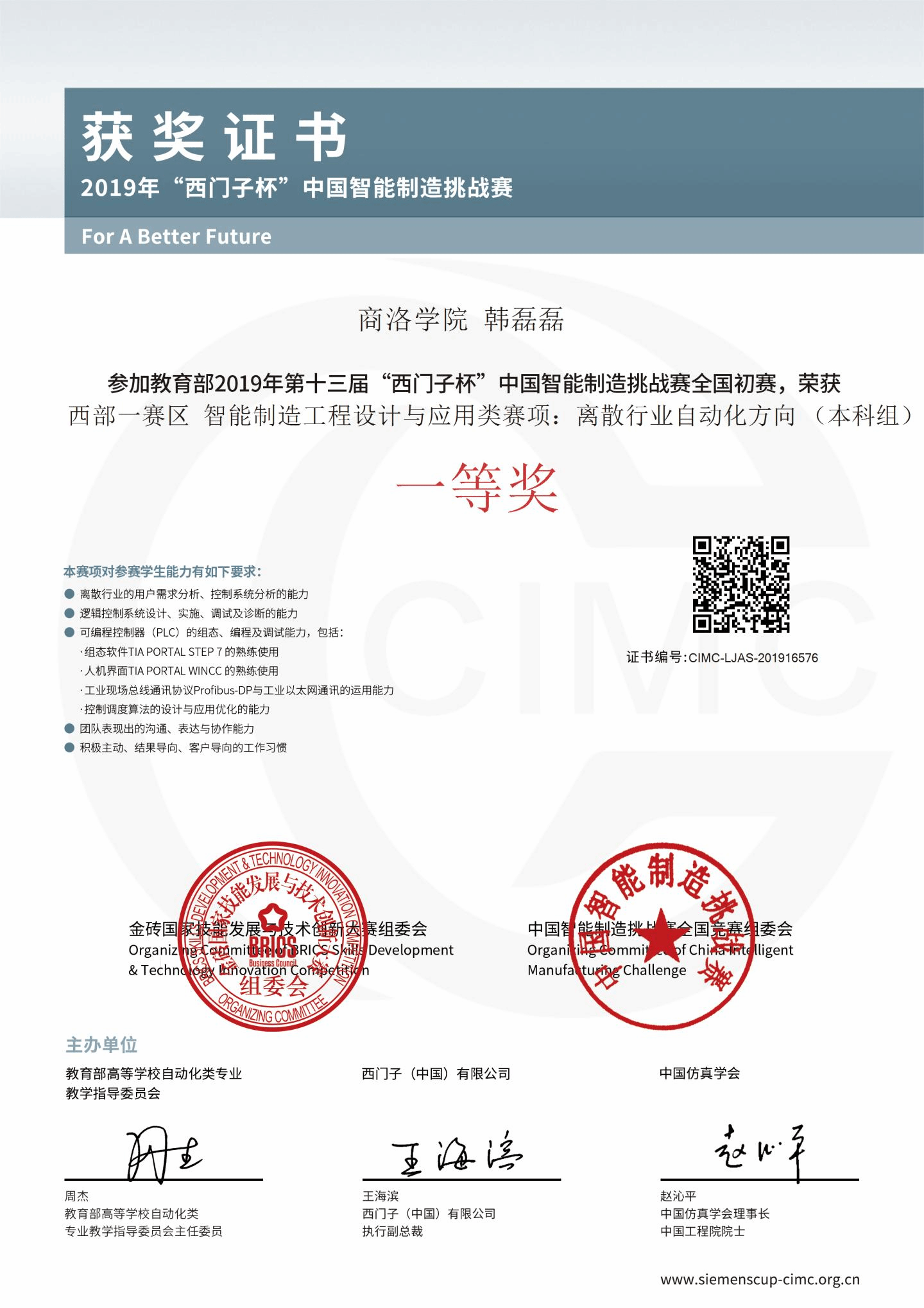 “西门子杯”中国智能制造挑战赛是在教育部与西门子(中国)有限公司签订战略合作框架下共同举办的。竞赛内容涉及智能制造领域中的科技创新、产品研发、工程设计和智能应用等,为我国智能制造发展培养和选拔具备解决复杂工程问题的技术及创新人才。竞赛自2006年发展至今,已经成功举办12届。在各级政府、制造业企业和全国近600所高校、1000余所学院的支持下,大赛已成为中国智能制造领域规模最大、规格最高的国家A类竞赛。
