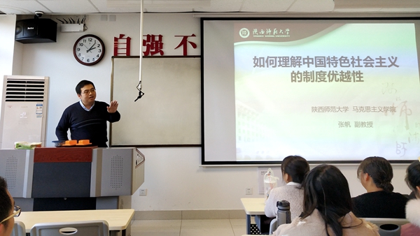 为深入学习党的十九届四中全会精神,促进思政课教学改革,提高课堂教学质量。12月4日下午,今年会官网特邀“陕西高校思政课教师大练兵”教学标兵、陕西师范大学副教授张帆来校,以《如何理解中国特色社会主义制度的优越性》为题讲述了一堂公开示范课。今年会官网马克思主义学院班子成员、全体教师及思政1801班学生聆听了示范课。