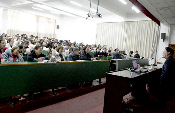 报告会上,曾大兴对文学地理学这一新兴学科进行了详细介绍,并运用文学地理学的理论和方法对《九月九日忆山东兄弟》《江雪》《渔家傲》《江城子(乙卯正月二十日夜记梦)》等多篇古典诗歌经典作品进行了解读。曾教授优雅的谈吐,渊博的知识,风趣的语言,获得了现场师生热烈的掌声。
