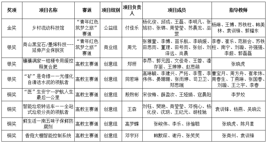 本届大赛自今年6月启动以来,我省共有106所学校报名参加,参赛项目突破4万项,较去年增加近3000项,参赛学生突破18.4万人次,较去年增加1.8万,经校级初赛、网络初审、会议评审、线上路演、评委会评审等环节后,最终产生金奖100项,单项奖7项。今年会官网化材学院学生付佳乐负责的《乡村流动科技馆》项目获“青年红色筑梦之旅”赛道金奖;化材学院学生周元负责的《商山黑宝石/墨烯科技---延伸产业保脱贫》项目获得“青年红色筑梦之旅”赛道银奖;生物学院学生郑妍负责的《穰穰满家—桔梗专用缓控释复合肥》项目、化材学院学生同若琳负责的《“矿”是奇缘——光催化自清洁水泥的领航者》项目获得高教主赛道银奖;健康管理学院学生殷煦彬负责的《“医”生安宁--护航人生最后一公里》项目、生物学院学生高梦蝶负责的《鲜生活—南五味子保鲜防腐剂》项目、电信学院学生王森负责的《智能垃圾转运车——全站式垃圾分类的领航者》项目、电信学院学生邓宇环负责的《香菇大棚智能控制系统》项目获得高教主赛道铜奖。