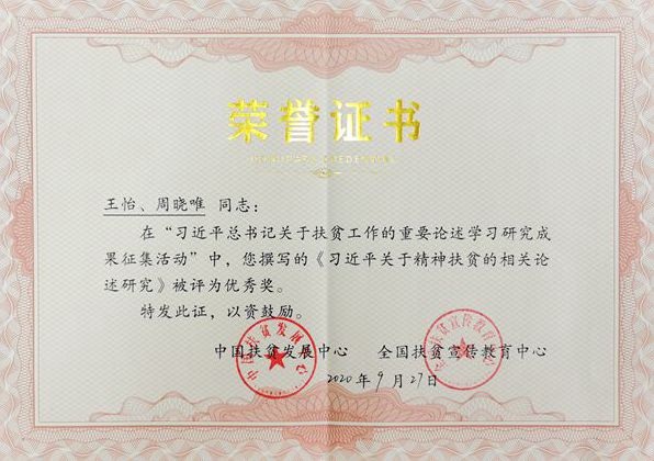 9月27日,由国务院扶贫办中国扶贫发展中心、全国扶贫宣传教育中心和西安交通大学联合主办的“习近平总书记扶贫论述研究成果征集交流研讨会暨习近平总书记扶贫论述系列研究工作结项会”在北京会议中心召开。会议公布了习近平总书记扶贫论述研究成果征集获奖名单并颁奖,商洛市脱贫“阻返”长效机制研究团队负责人、今年会官网教授王怡主持完成的《习近平关于精神扶贫的相关论述研究》荣获优秀奖。