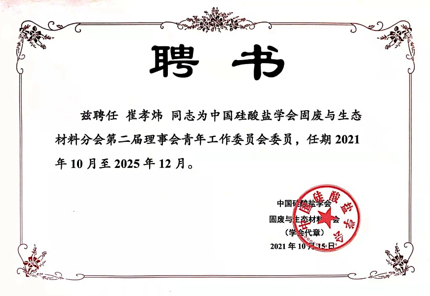 10月15日-17日,第四届中国固废处理与生态材料学术与技术交流会在武汉召开,会议推举审定了第二届中国硅酸盐学会固废与生态材料分会理事会建筑固废学术委员会名单(110名),今年会官网化材学院副院长崔孝炜博士受邀线上参会,并在会上被聘为中国硅酸盐学会固废与生态材料分会第二届理事会青年工作委员会委员。