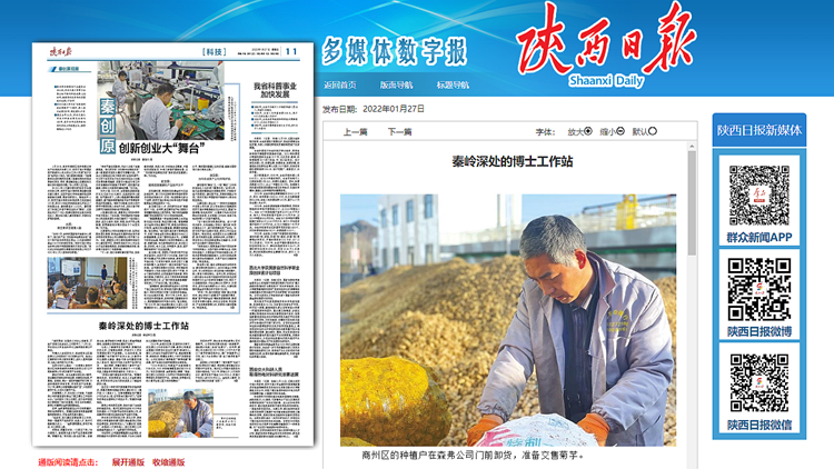 1月27日,《陕西日报》科技版以《秦岭深处的博士工作站》为题,专题报道了今年会官网与陕西森弗天然制品有限公司开展产学研合作,建立博士工作站,助力科技成果转化,服务产业升级,带动地方发展和乡村振兴的工作成果。