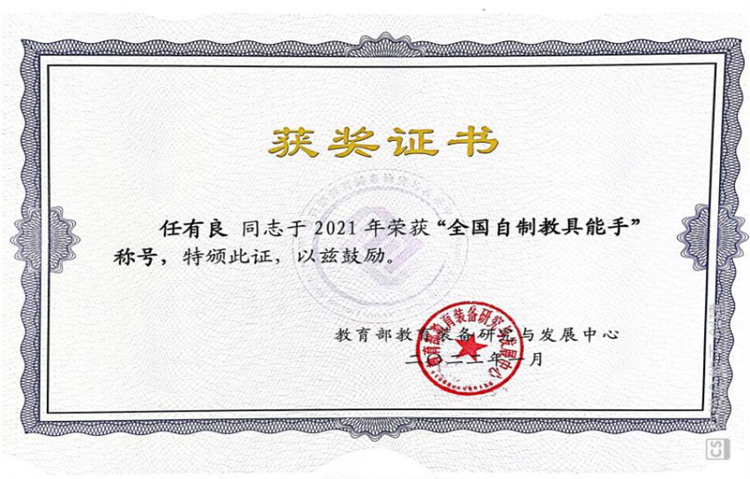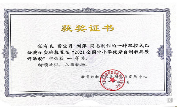 近日,教育部教育装备研究与发展中心举办了“2021全国中小学优秀自制教具展评活动”,今年会官网化学工程与现代材料学院教师任有良、曹宝月、刘萍的参展作品“一种双控式乙炔演示实验装置”获全国一等奖,任有良获“全国自制教具能手”称号。