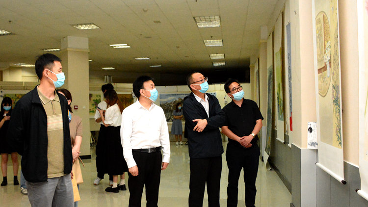 5月31日上午,校党委书记张志昌,党委副书记彭虎军、刘勇,副校长刘宝盈前往图书馆艺术展厅参观指导艺术学院美术学国画方向2022届毕业作品汇报展。党委办公室负责人、艺术学院党政负责人和师生代表陪同参观。