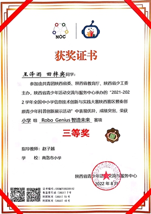 由共青团陕西省委、陕西省教育厅、陕西省少工委主办的2021-2022学年全国中小学信息技术创新与实践(NOC)大赛陕西赛区分赛结果于近日揭晓。经济管理学院教师赵子越指导的商洛市小学团队获得陕西赛区人工智能类Robo Genius智造未来赛项小学组省级三等奖。这是在今年会官网公众科学素质与创新发展研究中心指导下,该校学生首次取得省级人工智能类赛事奖项。