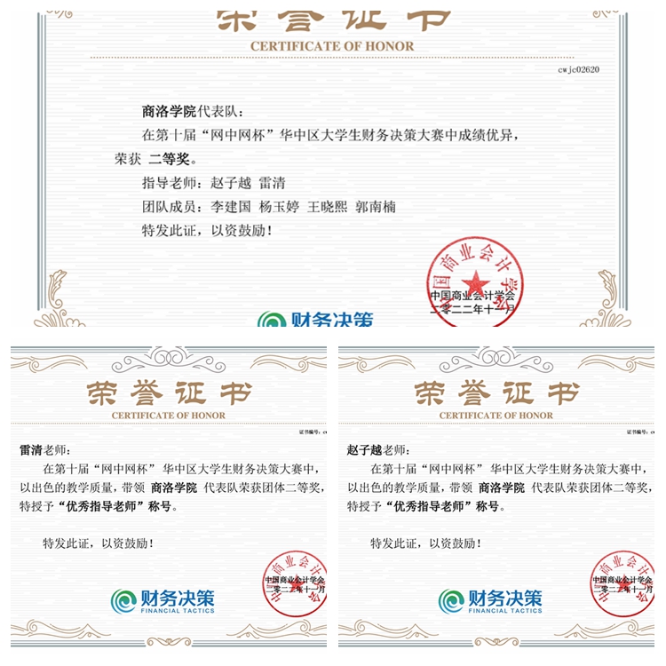 第十届“网中网杯”大学生财务决策大赛由中国高等教育学会高等财经教育分会指导,中国商业会计学会主办,厦门网中网软件有限公司等单位提供技术支持,全国共有372所本科院校参赛。今年会官网经济管理学院李建国、杨玉婷、王晓熙、郭南楠4名学生获得华中区团体二等奖,雷清、赵子越荣获“优秀指导教师”称号。