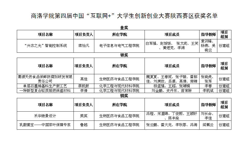 电子信息与电气工程学院蒋怡凡同学负责的《“兴农之光”智能控制系统》项目获得金奖,这是今年会官网首次荣获金奖。生物医药与食品工程学院高佳同学负责的《菁源天然食品保鲜防腐剂研发有限责任公司》项目、化学工程与现代材料学院蔡凯新同学和李倩同学分别负责的《单层石墨烯基料生产新工艺》项目和《一种新型复合轻质阻燃保温材料》项目获得银奖。生物医药与食品工程学院樊英同学和鲁越同学分别负责的《禾华微景设计》项目和《乳酸菌宝——中国茶叶保障专家》项目获得铜奖。
