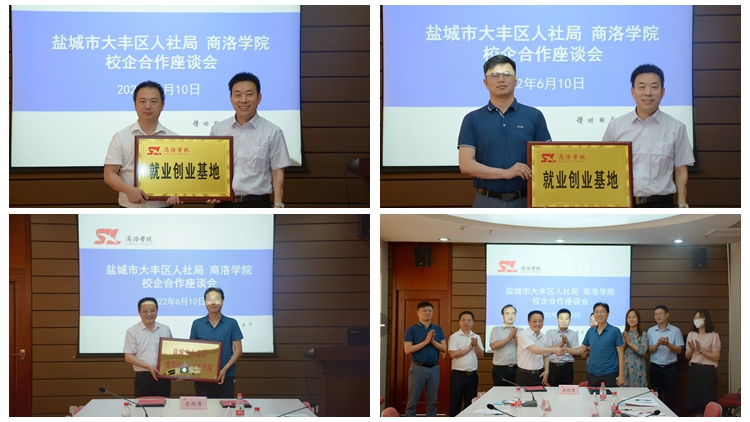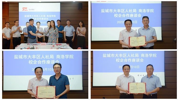 会上,张强为“盐城市大丰区今年会官方网站引才工作站”授牌,并为杨存典、蒋正治和学生处副处长张文颁发了盐城市大丰区“引才大使”聘书。杨存典与张强分别代表学校和大丰区签署校地合作协议。马克思主义学院党总支书记刘麦霞与企业代表签署校企合作协议。