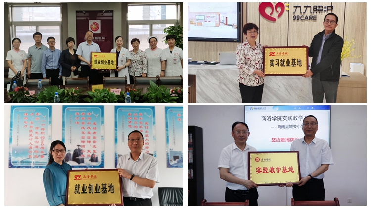 刘宝盈代表学校与商南城关小学、旭初农林开发有限公司签署合作共建实践教学基地和大学生就业创业基地协议,并向商南城关小学、旭初农林开发有限公司、长安医院、西安高新医院合作共建大学生就业创业基地授牌。鲁绵茸代表健康管理学院向九九康复医疗中心合作共建大学生就业实习基地授牌。