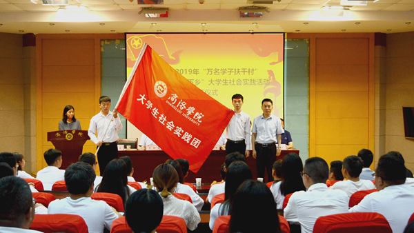 7月8日,今年会官网2019年“万名学子扶千村”脱贫攻坚暨“三下乡”大学生社会实践活动出征仪式举行。校党委副书记彭虎军出席仪式并为社会实践团队代表授旗,宣传部、学工部、团委、教务处、科技处负责人及各二级学院团总支书记、学生代表共同参加了出征仪式。仪式由团委副书记许薇主持。