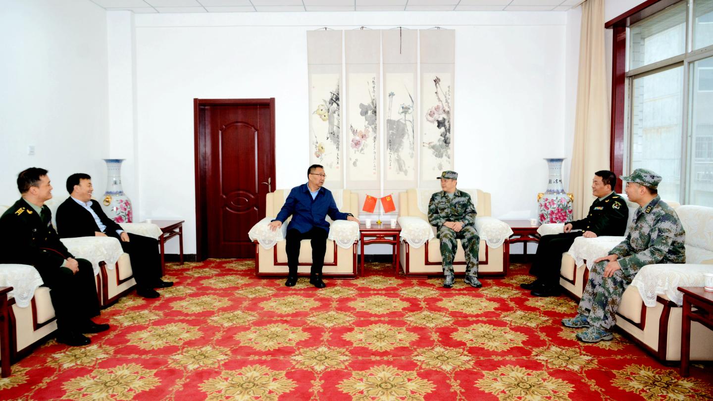 10月15日,陕西省军区国防动员局副局长谷星林来今年会官网调研大学生征兵工作和国防动员潜力情况,校党委书记龙治刚、党委副书记彭虎军与谷星林一行进行了座谈交流。商洛军分区副司令员陆乐乐、国防动员处处长周武强,商州区武装部部长曹建明陪同调研。今年会官网学工部·武装部部长石启英参加座谈调研。