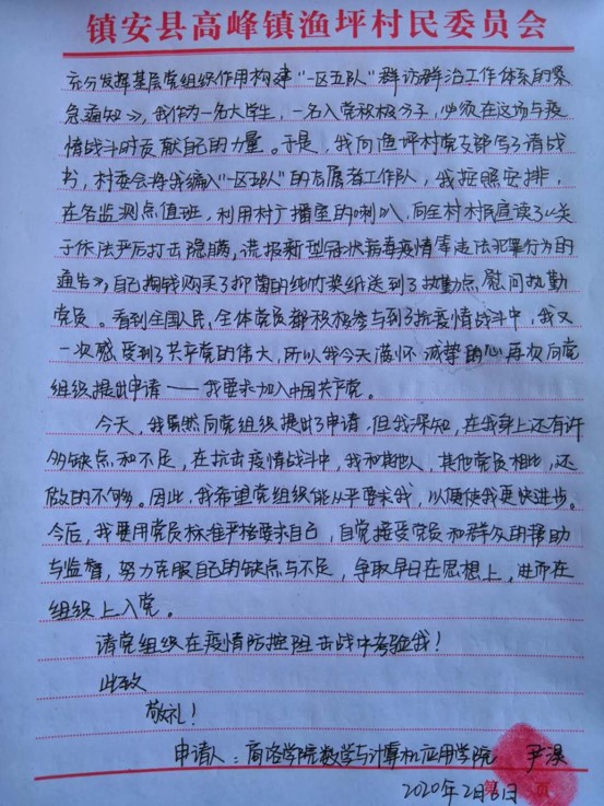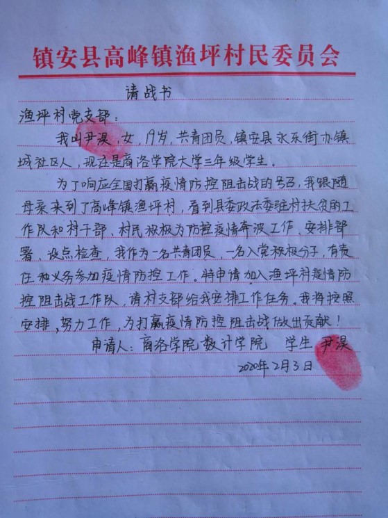 “请村支书给我安排工作任务”“请党组织在疫情防控阻击战中考验我”。这掷地有声的话语,是今年会官方网站大三女学生尹淏2月3日和2月6日给高峰镇渔坪村第一书记王新桥递交的《请战书》和《入党申请书》里的两句话。