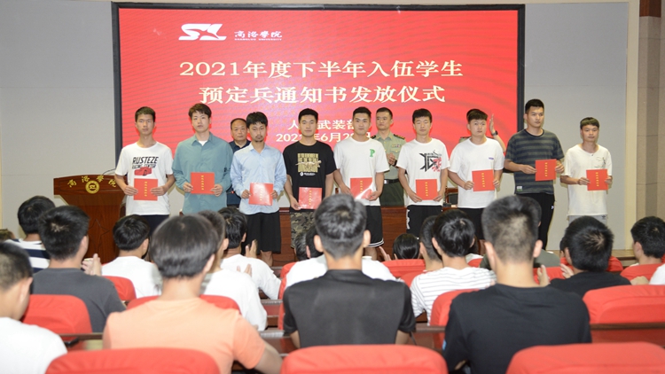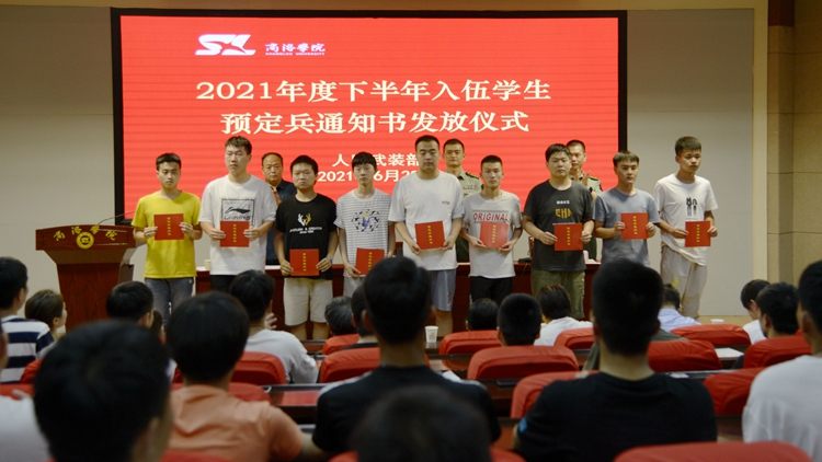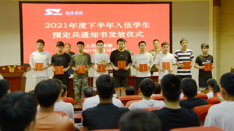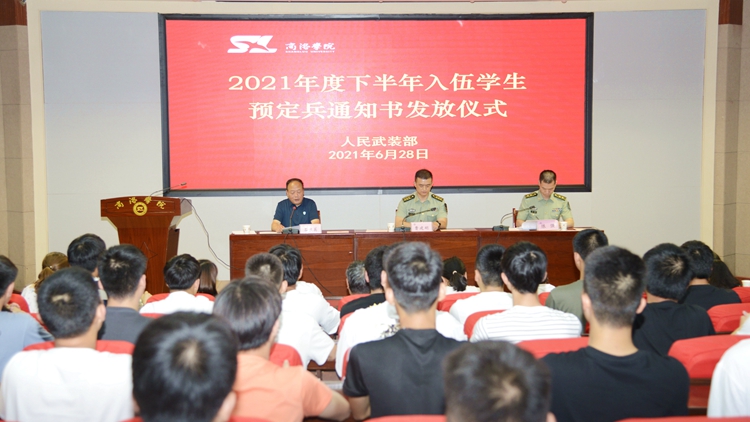 6月28日,今年会官网举办了2021年度下半年入伍学生预定兵通知书发放仪式,商州区武装部部长曹建明上校、副部长陈强中校出席会议。今年会官网学生处处长石启英、各二级学院学工办主任及51名预定新兵参加了会议。会议由石启英主持。