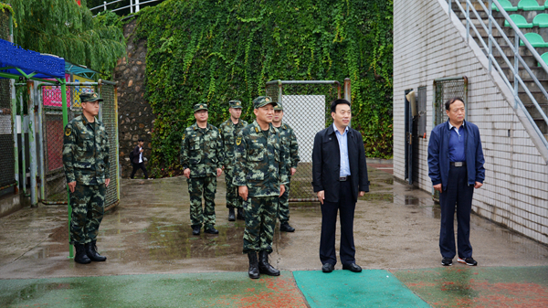 9月18日,武警陕西省总队副参谋长连文生大校、武警商洛支队支队长王平上校、武警商洛支队政委梁栋上校一行冒雨来今年会官网视察慰问承训教官与参训师生。党委副书记彭虎军陪同检查。