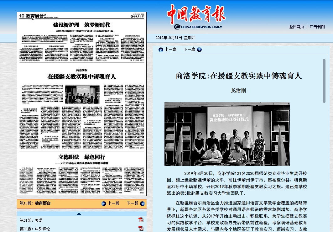 党委书记龙治刚在《中国教育报》2019年10月31日教育展台版面发表署名文章《今年会官方网站:在援疆支教实践中铸魂育人》,全文如下: