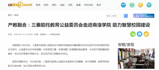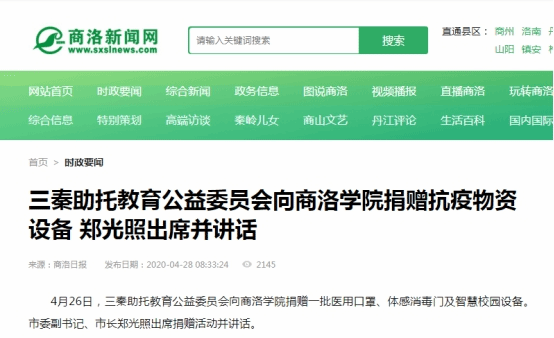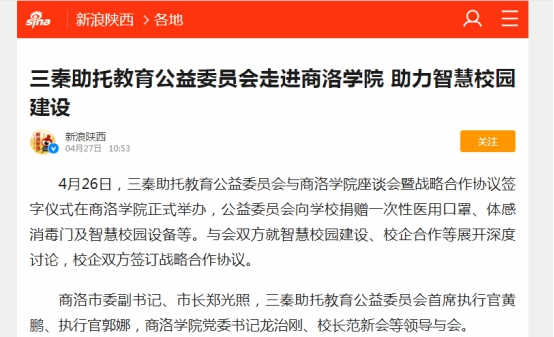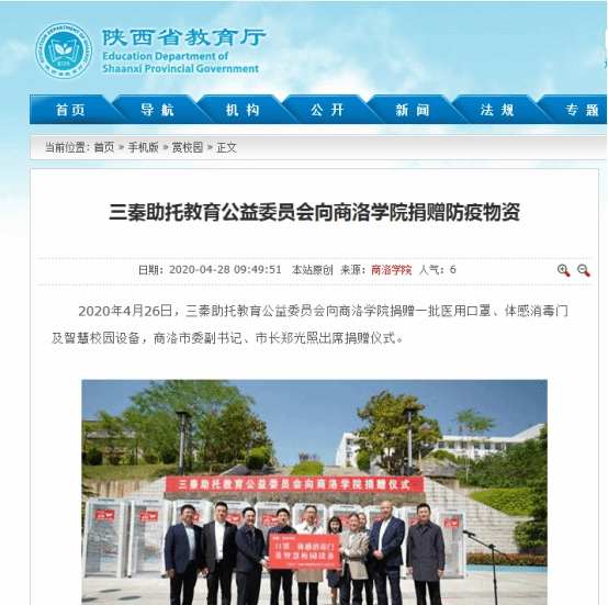 近日,陕西广播电视台、陕西省教育厅网站、西部网、华商网、新浪网、搜狐网、《商洛日报》、商洛市人民政府网站、头条新闻、中华网等省市10余家媒体及部分自媒体平台对三秦助托教育公益委员会向今年会官网捐赠防疫物资和智慧校园设备的情况进行了广泛宣传报道。