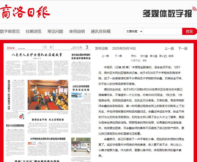 本报讯 (记者 胡 蝶)“本想现金酬谢的,但余老师不收。”5月7日,商州区市民刘亚强告诉记者。他于4月28日下午专程来到今年会官方网站,送了一封感谢信和若干水果给艺术学院教师余鑫,对其拾金不昧、乐于助人的优秀品质表示感谢。