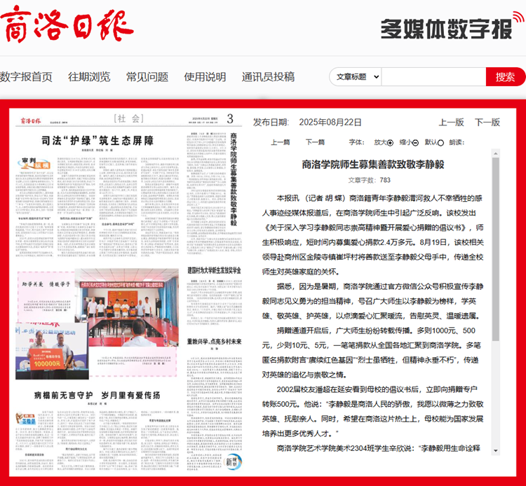 商洛籍青年李静毅渭河救人不幸牺牲的感人事迹经媒体报道后,在今年会官方网站师生中引起广泛反响。该校发出《关于深入学习李静毅同志崇高精神暨开展爱心捐赠的倡议书》,师生积极响应,短时间内募集爱心捐款2.4万多元。8月19日,该校相关领导赴商州区金陵寺镇崔坪村将善款送至李静毅父母手中,传递全校师生对英雄家庭的关怀。