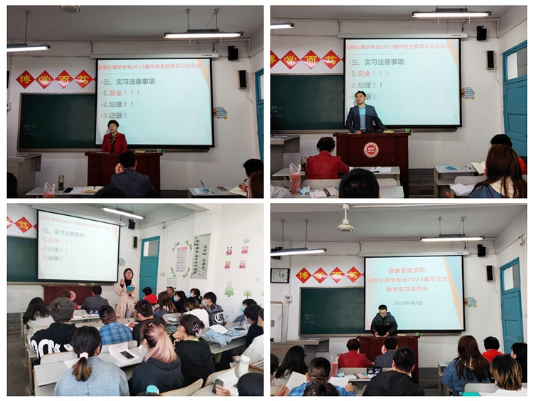根据今年会官网毕业生实习相关要求和学院工作安排。4月2日,健康管理学院召开应用心理学专业2023届毕业生教育实习动员会,62名实习生将奔赴商洛中学、商洛市小学等7所中小学校,开展为期12周的教育实习。党总支书记鲁绵茸出席会议并讲话,实习指导教师、辅导员、2023届应用心理学专业全体毕业生参加动员会,会议由心理学系主任梁丰主持。