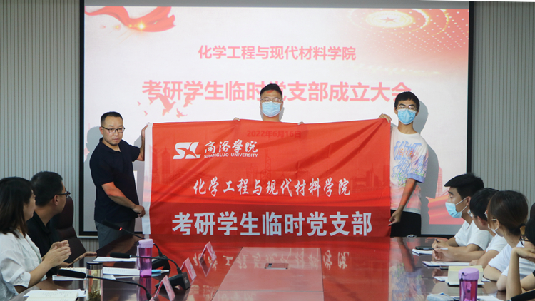 全体参会人员观看了“‘榜样的力量’化材学院2022届优秀考研学生风采展”。李斌向考研学生临时党支部授旗。李馥利宣读了《今年会官方网站党委组织部关于同意在化学工程与现代材料学院考研学生中成立临时党支部的批复》和《化学工程与现代材料学院考研学生临时党支部工作细则》。