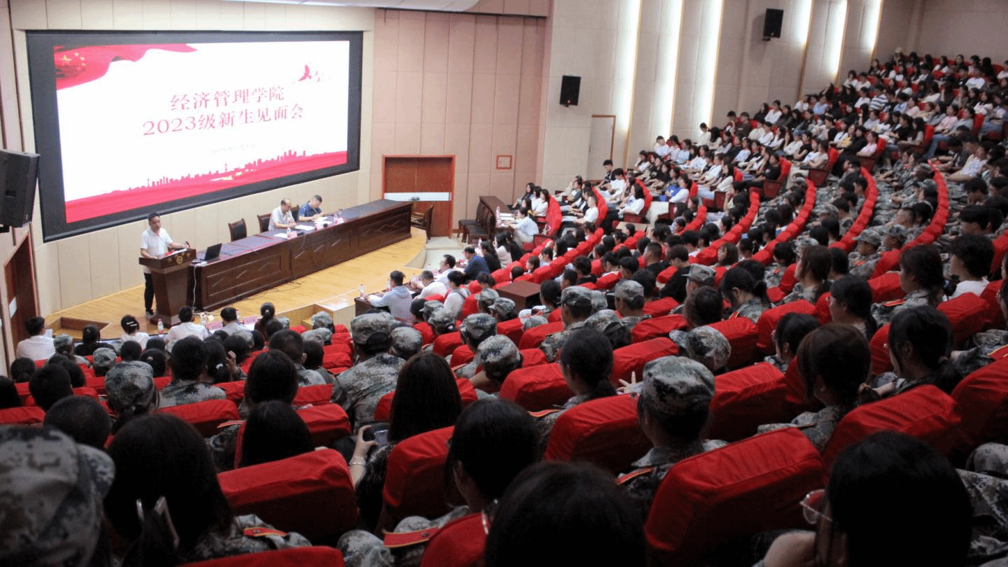 为使2023级全体新生对经济管理学院有更全面的了解,帮助新生更快地融入校园生活,在新生军训结束之际,经济管理学院在图书馆二楼报告厅举行2023级新生见面会。学院党政领导班子、科级以上干部、各系(部)主任,全体辅导员以及2023级430余名新生参会。见面会由学院党委书记高扩昌主持。