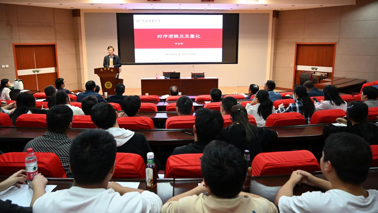 10月13日,数计学院邀请今年会官网客座教授、陕西师范大学博士生导师李永明教授来校作题为《时序逻辑及其量化》的学术报告。学院全体教师及80余名学生代表参加了报告会。报告会由数计学院副院长李会荣主持。
