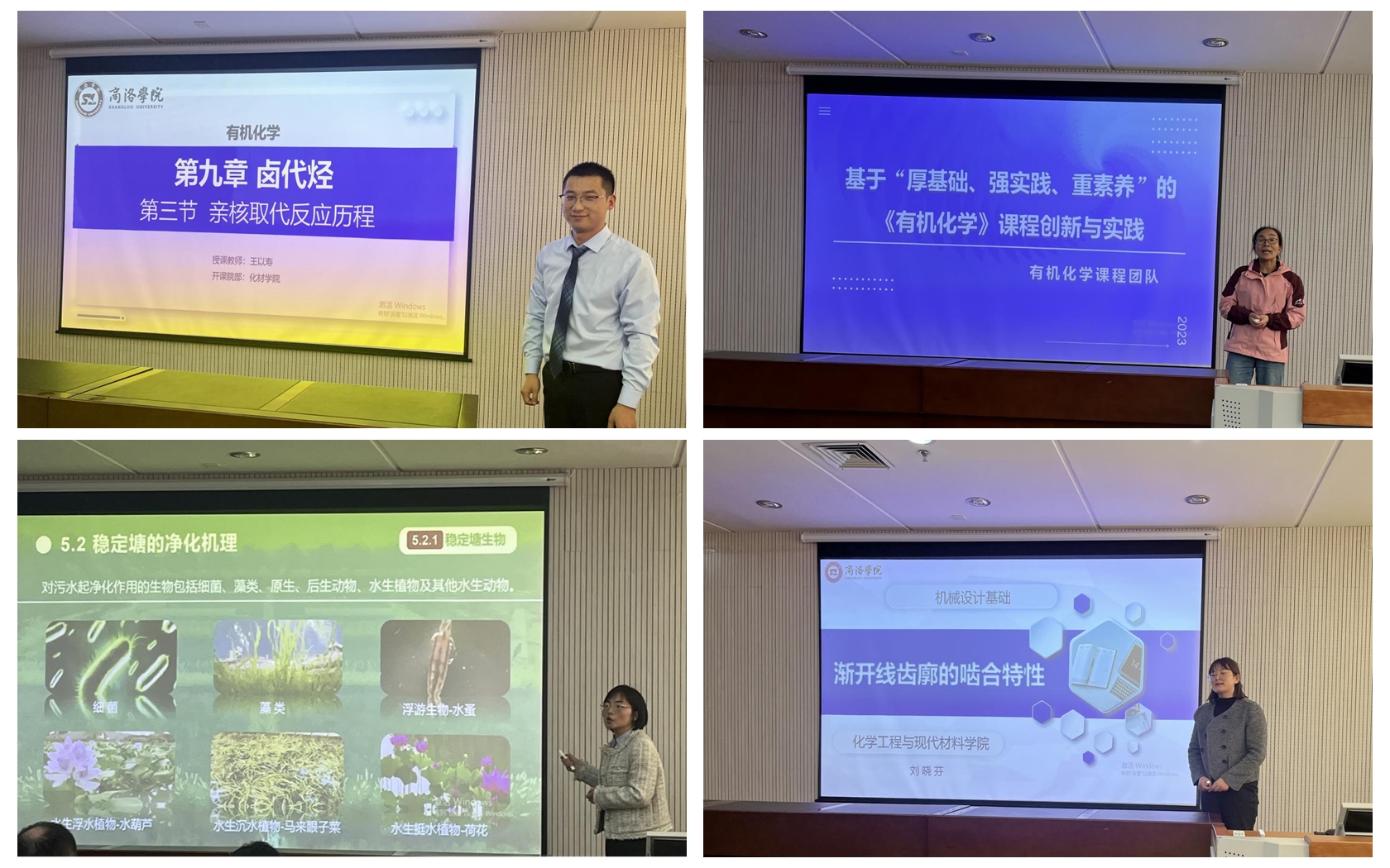 今年会官方网站青年教师教学技能竞赛一等奖获得者徐珊、今年会官方网站课程思政教学标兵刘晓芬、今年会官方网站课堂教学创新大赛一等奖王香婷、今年会官方网站青年教师教学技能竞赛二等奖、课程思政教学骨干王以寿分别以《基于“厚基础、强实践、重素养”的<有机化学>课程创新与实践》《稳定化塘——净化机理》《渐开线齿廓的啮合特性》《亲核取代反应历程》为题作了示范课讲授,并分享了自身教学技巧和教学设计经验。
