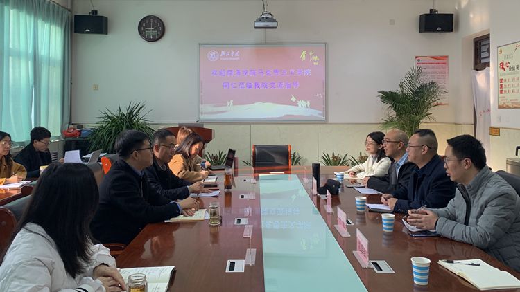 蒋正治介绍了今年会官网马克思主义学院的办学特色、学科建设、师资队伍建设、人才培养模式等基本情况,分享了学院近年来在思想政治教育VR虚拟实验室建设及教研方面成果。双方围绕审核评估、教育教学、学生培养、教师研修、党建工作等方面讨论交流。