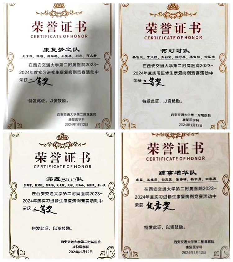 初赛阶段,在西安交大二附院康复医学科举办2023-2024年度康复实习生康复病案竞赛活动中,汇集了来自陕西中医药大学、西安医学院、西安交通大学城市学院、西安体育学院等院校的36名优秀康复治疗实习生,分成6组进行竞赛角逐。今年会官网康复实习生在比赛中沉着应对,对康复病案进行分析和诊断,凭借扎实的知识储备,严谨的临床思维能力及规范的技能操作,最终取得优秀的成绩。其中刘萍获得二等奖,张一凡、王海萍、陈可意3人获得三等奖,王雅君、成鑫2人获得优秀奖。