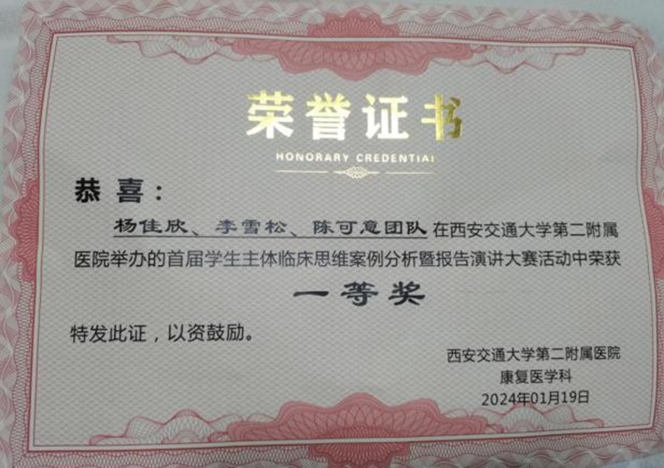 1月17日,西安交通大学第二附属医院举办首届“明德知行,慎思医道”学生主体临床思维案例分析大赛总决赛。健康管理学院20级康复治疗学专业实习生组队参加,与众多实习生、研究生和规培生同台竞技。最终陈可意团队以冷静的头脑、精准的判断、深入的分析,流利的言语表达和形象的情景演绎,获得一等奖。