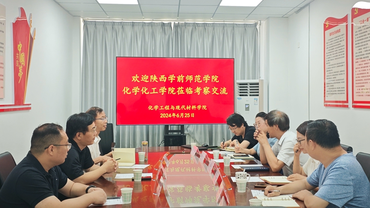 周春生详细介绍了化材学院办学条件、专业设置、科学研究、教育教学、人才培养等方面情况。李连庆介绍了陕西学前师范学院化学化工学院发展情况。双方围绕学科专业建设、人才培养、师资队伍建设、实习基地建设和本科教学审核评估等展开了深入的交流。