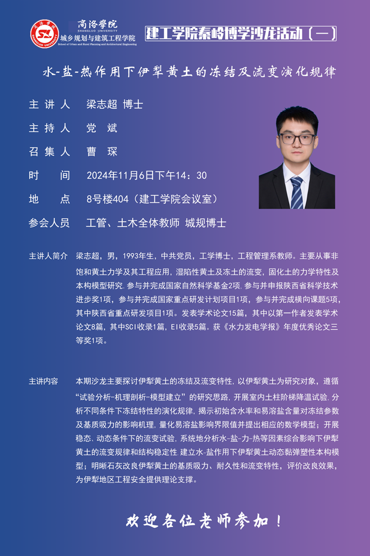 在首场活动中工程管理系梁志超博士进行了“水-盐-热作用下伊犁黄土的冻结及流变演化规律”的主题发言,梁志超分别从研究支撑条件、研究背景、研究成果及未来展望四个方面对水-盐-热作用下伊利黄土的冻结及流变演化规律进行了分享。针对梁志超的研究内容,米文静和刘国栋两位博士分别进行了交流发言,其余老师也积极交流、讨论。同时,老师们结合近期个人在阅读文献、撰写论文、投稿、申报项目、在研项目中存在的问题和所思所想进行交流。学术活动氛围非常活跃、轻松。