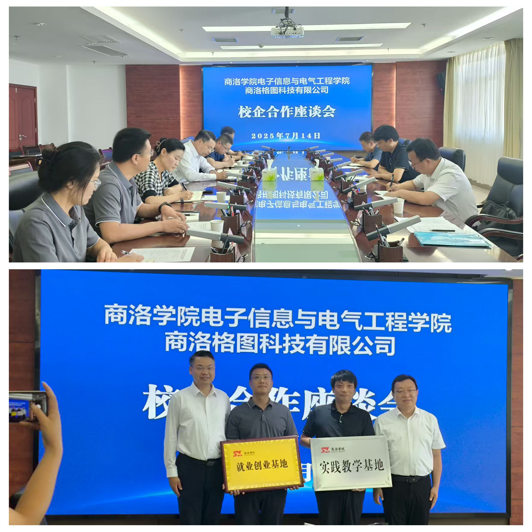 会上,吴成斌详细介绍了企业核心业务、技术研发方向及未来发展规划。陈垚介绍了电信学院的基本情况。陈垚和吴成斌代表双方签订了共建合作协议,并为就业创业基地与实践教学基地揭牌。