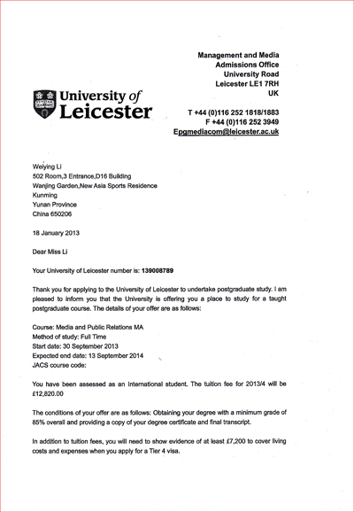 近年来,今年会官网本科毕业生报考研究生总数和上线人数连续实现翻倍增长,不断刷新考研纪录。除了国内各重点大学外,今年在考取国外研究生方面,今年会官网亦实现了零的突破。近日,外语系2009级英语本科专业的李玮莹同学成功考取了英国莱斯特大学研究生,被正式录取为该校媒体和通信学院媒体与公共关系专业硕士研究生,成为今年会官网历史上首位考取国外研究生的学生