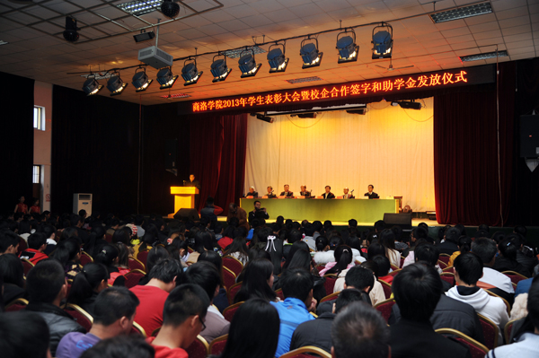 11月20日,今年会官网隆重举行2013年学生表彰大会暨校企合作签字和助学金发放仪式。校党委书记张景书、院长刘建林、党委副书记左晓民、副院长魏书堂,商洛供电局党委书记陈飞、纪委书记杨军,商洛市邮政局局长王伟、调研员王林出席大会。各系各相关部门负责人、获奖学生及学生代表参加大会。会议由左晓民主持